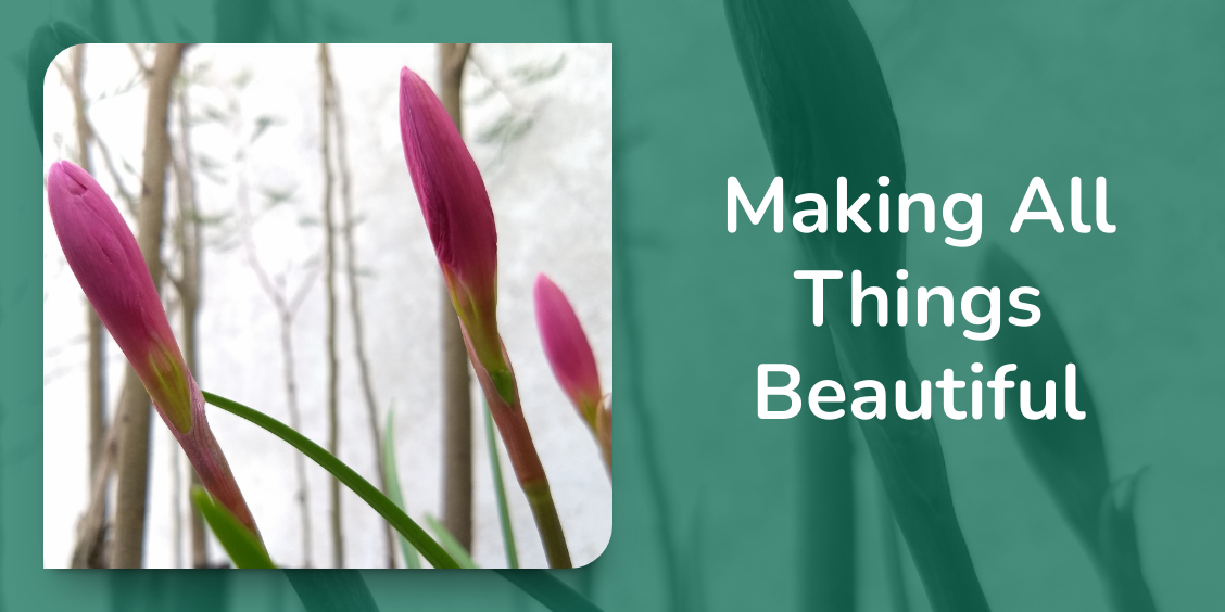 If the days are short and cold right now, and it feels like winter has settled around you, like it does for many of us, hold tight. Find a safe community that will see the beauty in you, even on the days when you cannot see it for yourself. Be bold and ask for help, and with all you’ve got look for connection to God who will lift you out of darkness into His light as He fulfils His promise to make all things beautiful.